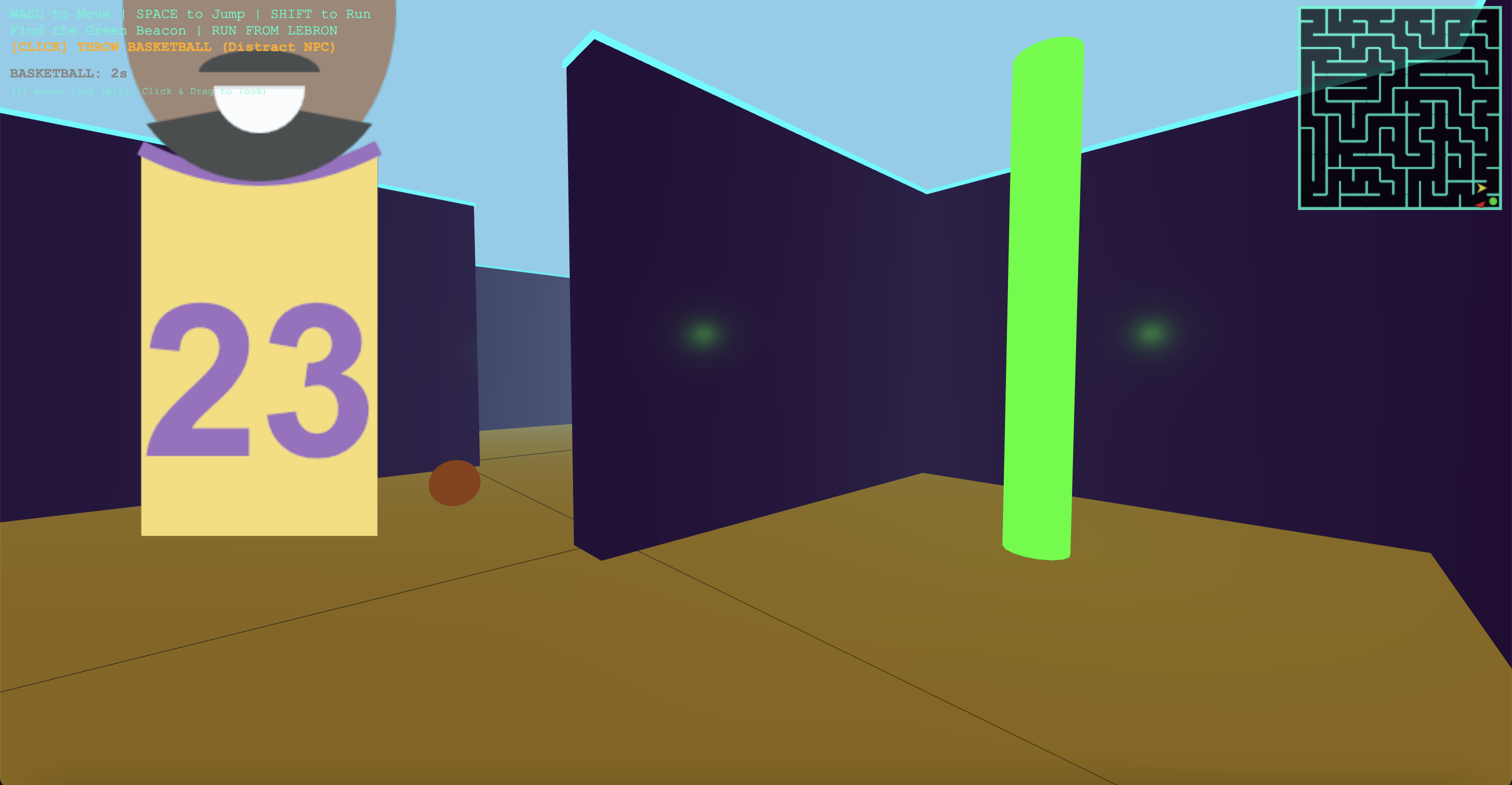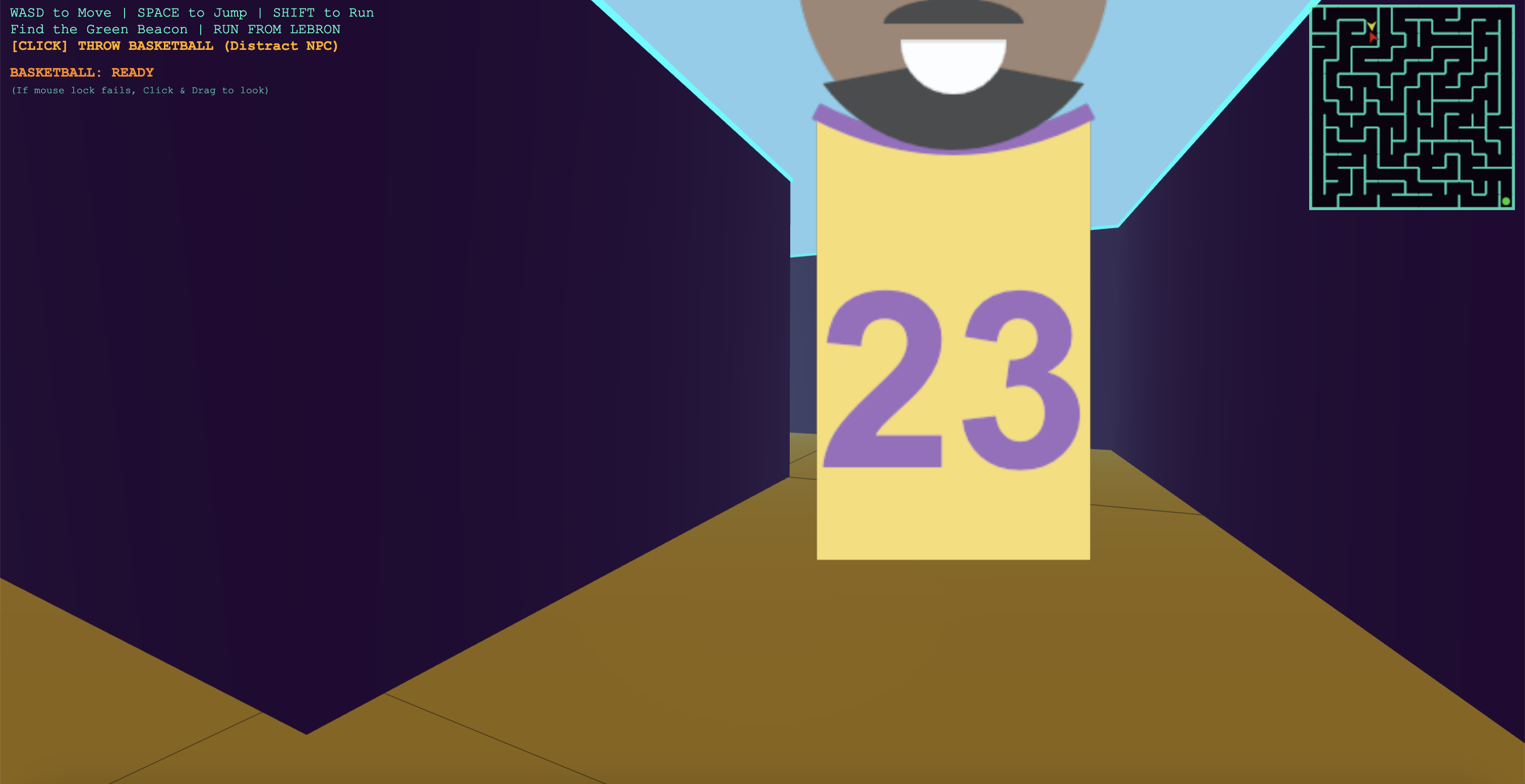 "Escape LeBron: Mamba Maze" is a browser-based, first-person 3D survival game. Players navigate a procedurally generated maze to find a green victory beacon while avoiding a relentless LeBron James NPC that chases them.